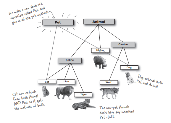 Animal a=new Dog(); 을 하고 a의 모든메서드를 실행시키면 Animal에는 없지만 Pet에만 있는 메서드가 있기에
