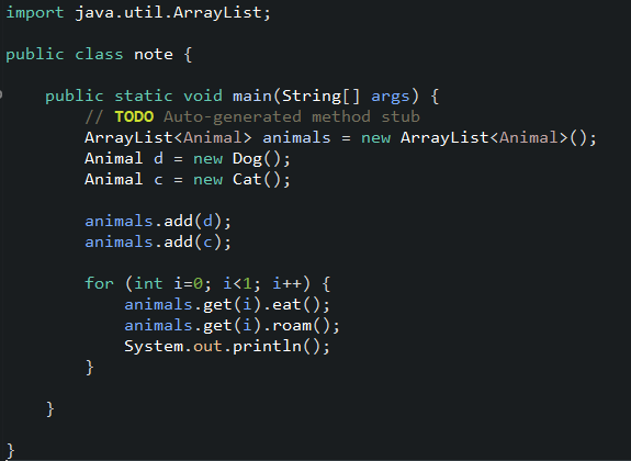 <Animal>타입의 animals 리스트를 생성하고 순서대로 Dog,Cat객체를 담은뒤 for문을 이용하여 해당객체의 메서드를 실
