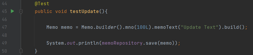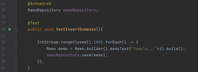 100개의 새로운 Memo 객체를 생성하고 MemoRepository를 이용하여 이를 insert하는 메서드 구현