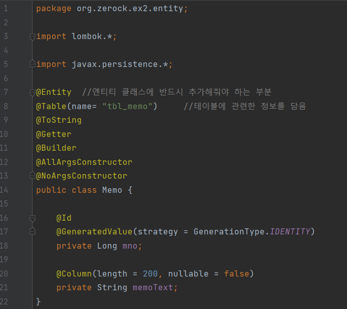 Main > java > org.zerock.ex2 밑에 entitiy 패키지를 만들어 준 후, Memo 클래스를 정의한다