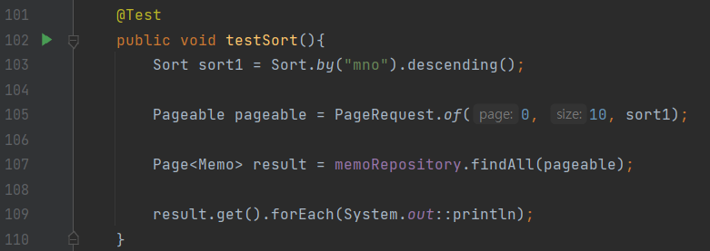 mno필드의 값을 역순으로 정렬하도록 Sort.by(필드).desending()하여 PageRequest 파라미터로 전달