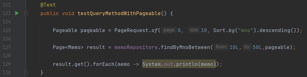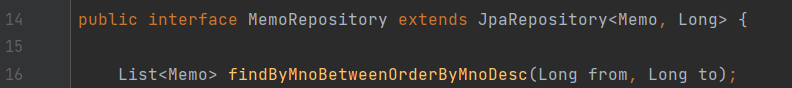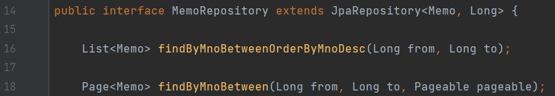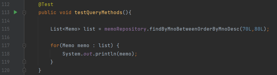 쿼리 메서드 예제1) Memo 객체의 mno 값이 70~80 사이의 객체들을 구하고 mno를 역순으로 정렬