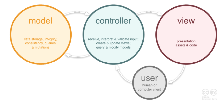 사용자가 controller를 조작하면 controller는 model을 통해서 데이터를 가져오고 그 정보를 바탕으로 시각적인 표현을 담당하는 View를 제어해서 사용자에게 전달하게 된다.