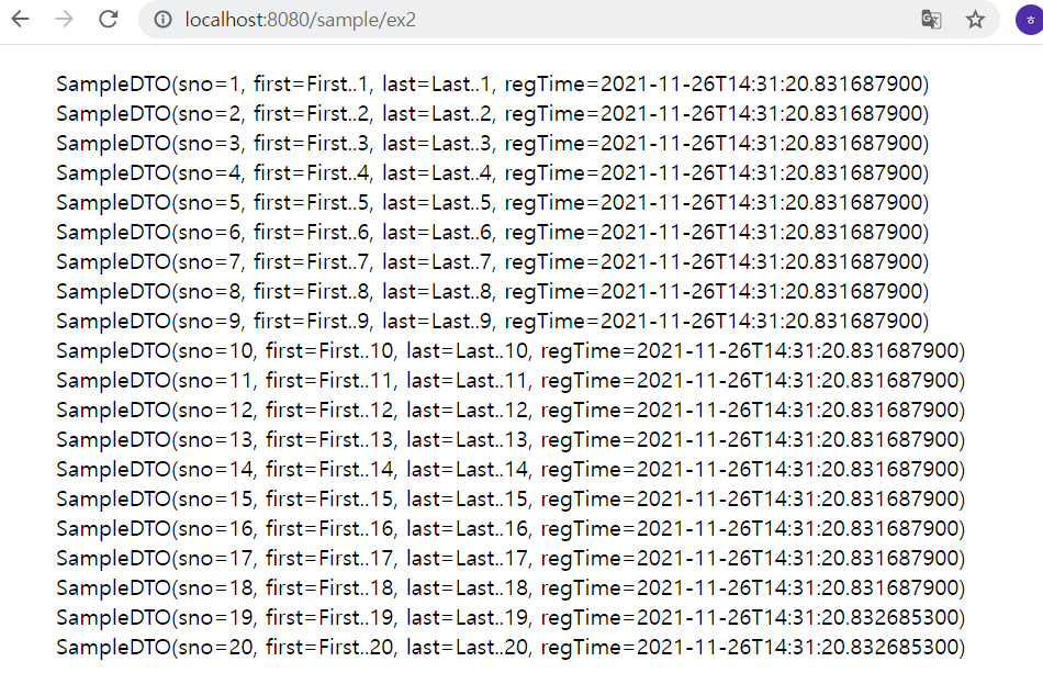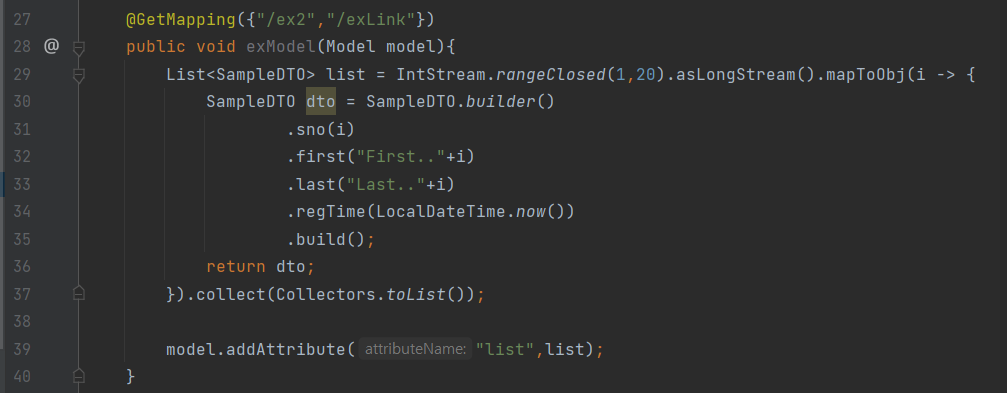 SampleController클래스의 exModel메서드를 선언해주고 위와같이 선언된 변수에 20개의 객체를 넣어준후 이를 Model에 담아서 전송한다.
