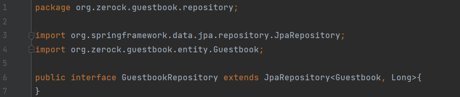 엔티티 객체들을 처리하는 기능을 가진 Repository 인터페이스를 작성한다. JpaRepository를 상속받도록 인터페이스를 구성한다.