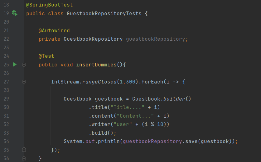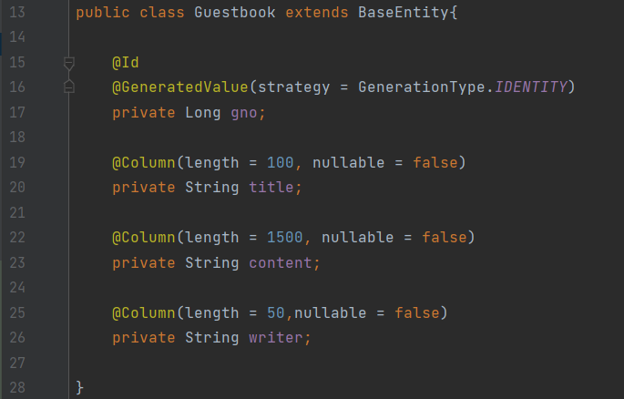 entity패키지에 Guestbook 엔티티 클래스를 위와 같이 작성한뒤, 맨위에서 작성해준 BaseEntity 클래스를 상속하여 작성한다.