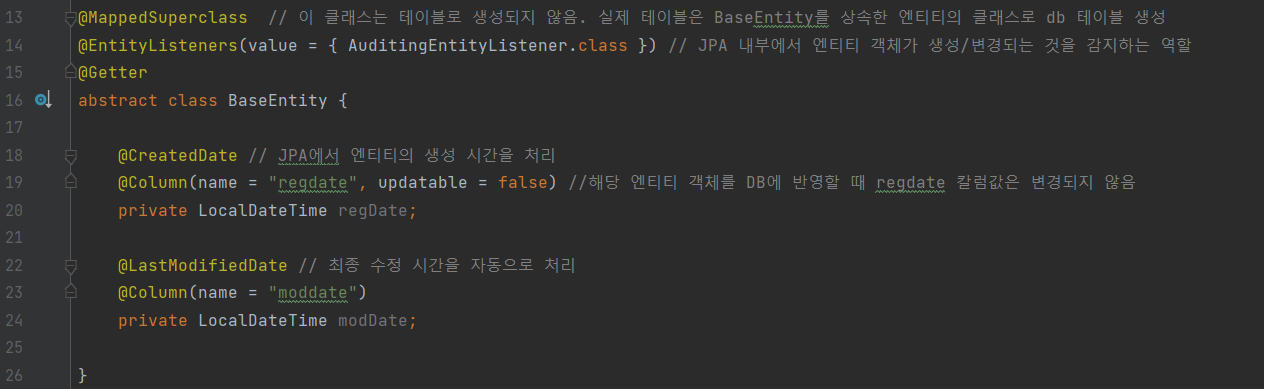 @LastModifiedDate : 최종 수정 시간을 자동으로 처리 ( updateable = false 지정으로 해당 엔티티 객체를 DB에 반영할 때 regdate 칼럼값은 변경되지 않음 )