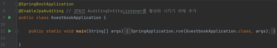 위에서 어노테이션 설정 후 AuditingEntityListener를 활성화시키기 위해서는 프로젝트에 @EnableJpaAuditing 설정을 추가해야한다. 따라서 프로젝트 생성 시에 존재하는 Application 클래스를 수정한다