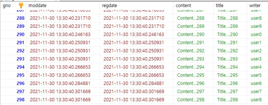 생성된 데이터의 moddate(생성 시간), moddate(수정 시간)이 자동으로 null이 아닌 값으로 채워지는 것을 확인할 수 있다.